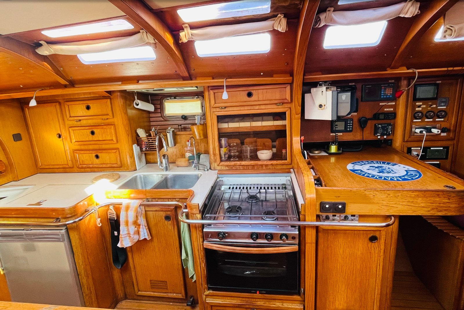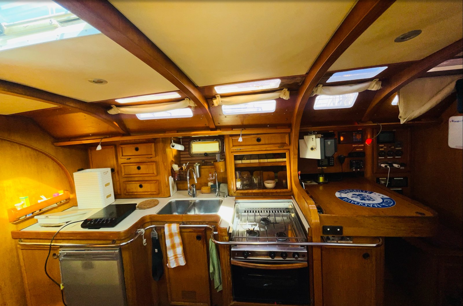 Gazinière ENO 3 feux + four, réfrigérateur Waeco, congélateur indépendant, double évier, pompe à eau douce et de mer, filtre Doulton.