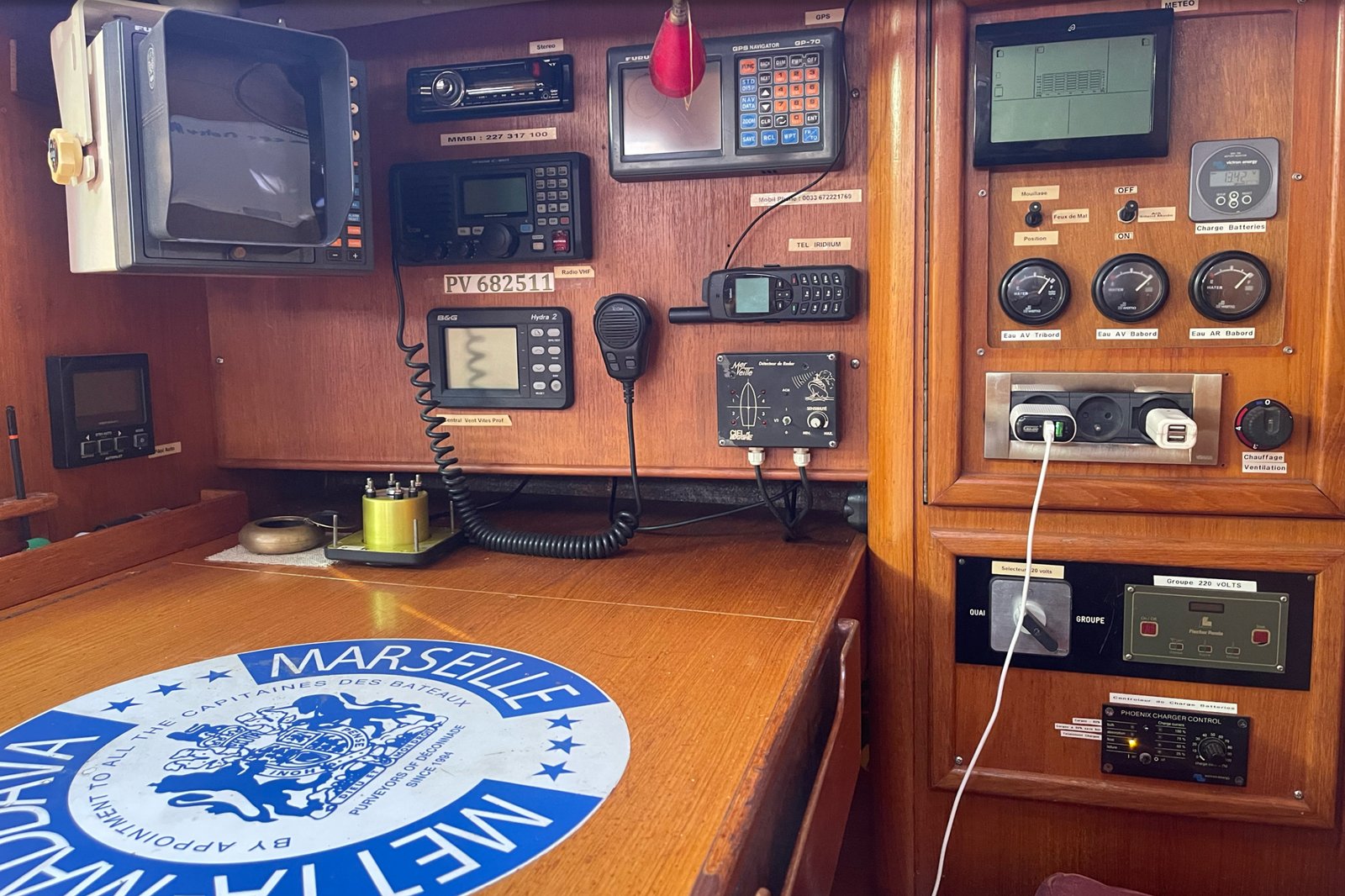Traceur B&G Zeus 2, centrale Hydra 2, radar Furuno, AIS EmTrack, pilote Simrad AP11, GPS Furuno, téléphone satellite Iridium, balise IPRB McMurdo G8 (2019).